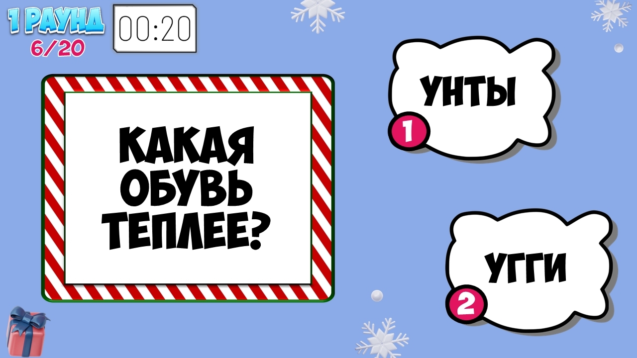 В каждом раунде по 20 вопросов, к которым предложены два варианта ответа (фифти-фифти или 50/50), таймер на обсуждение – 20 секунд.