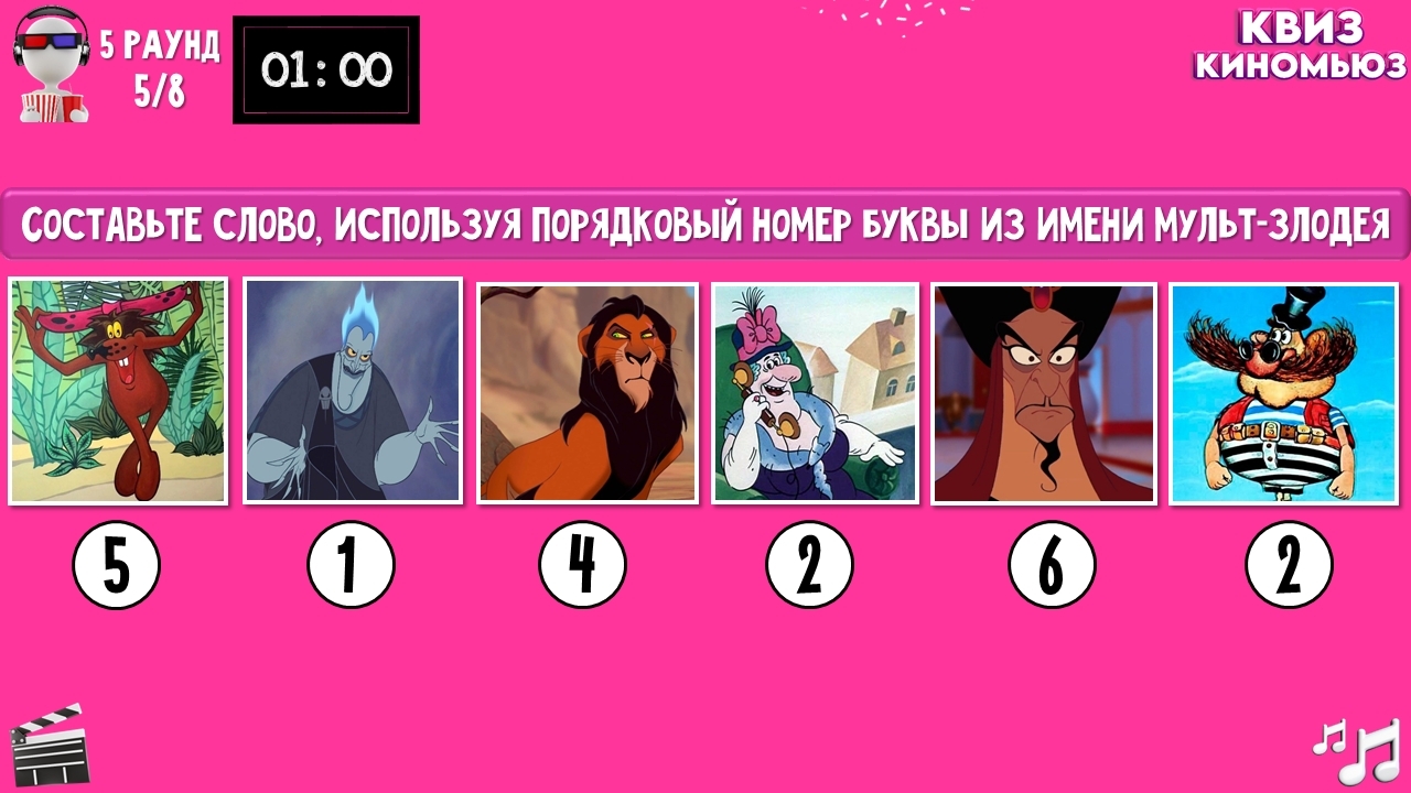 ✔ 5 РАУНД «ПЕРСОНАЖ» - 8 заданий, задача составить и записать слово, используя букву из имени каждого персонажа (номер буквы указан под фото), 1 минута на обсуждение.