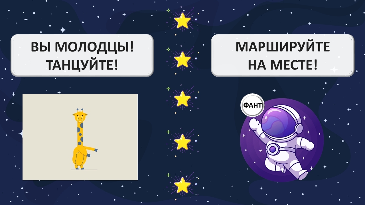 На раздумье - 5 секунд, затем танцевальными движениями нужно двигаться в сторону того ответа, который они считают правильным. Если думают, что это утверждение правда – двигаются влево, если нет – вправо. Затем появляется правильный ответ и все, кто ответил правильно – танцуют (на каждом вопросе разные музыкальные треки), а кто неправильно – выполняют задание! !